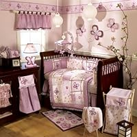 It's sweet dreams for your little slumberer with soothing sugar-plum shades and butterflies aflutter. This 6-piece bedding set instantly creates a delightfully coordinated nursery setting for baby. Set includes: Quilt, bumper, sheet, crib skirt, diaper stacker and valance. Quilt measures 35" x 42". Bumper is approximately 11" high including frill on top. Crib skirt has a 12" drop. Fitted sheet fits a standard-size crib mattress. Diaper stacker holds up to three dozen diapers. Valance measures 12" x 53".